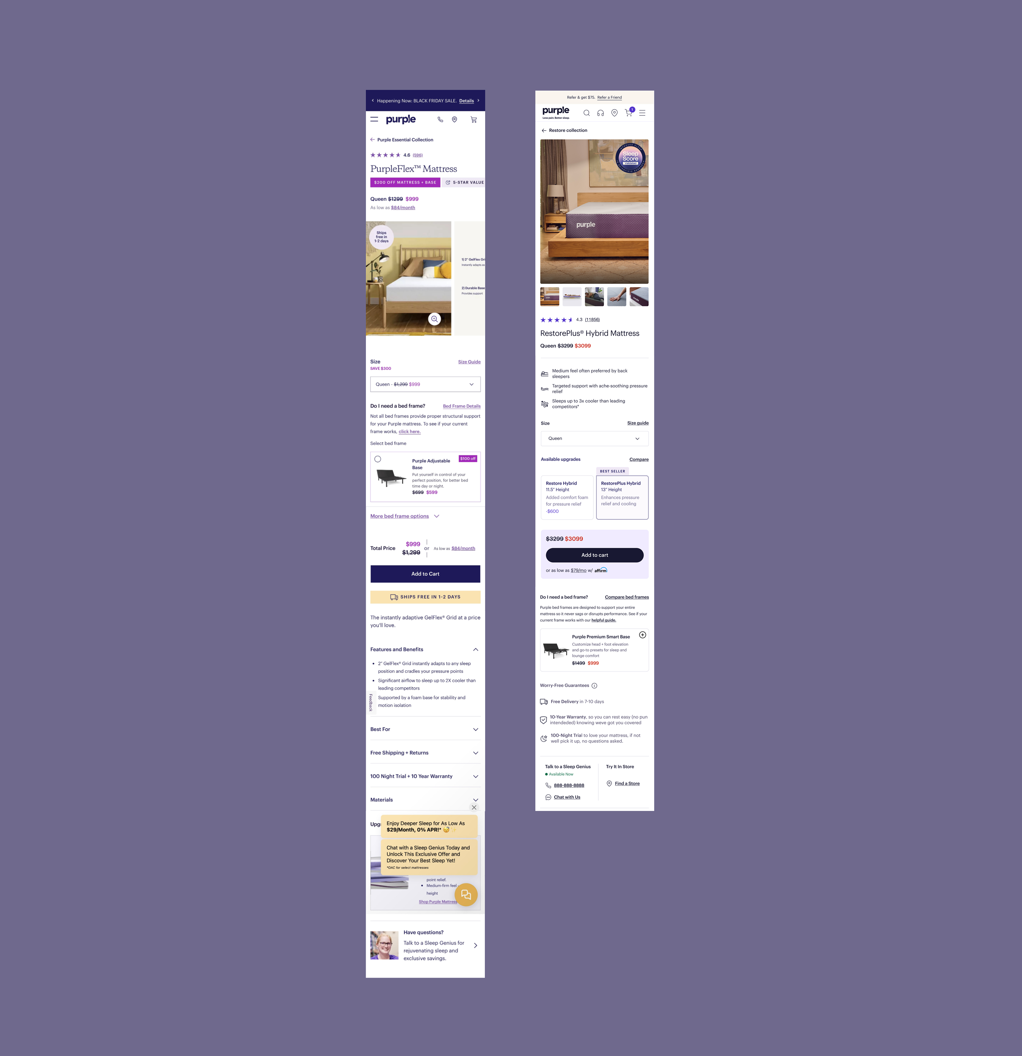 Purple’s mattress product pages contained a lot of information, pricing variables, and feature differentiation that often led to customer confusion and hesitation.